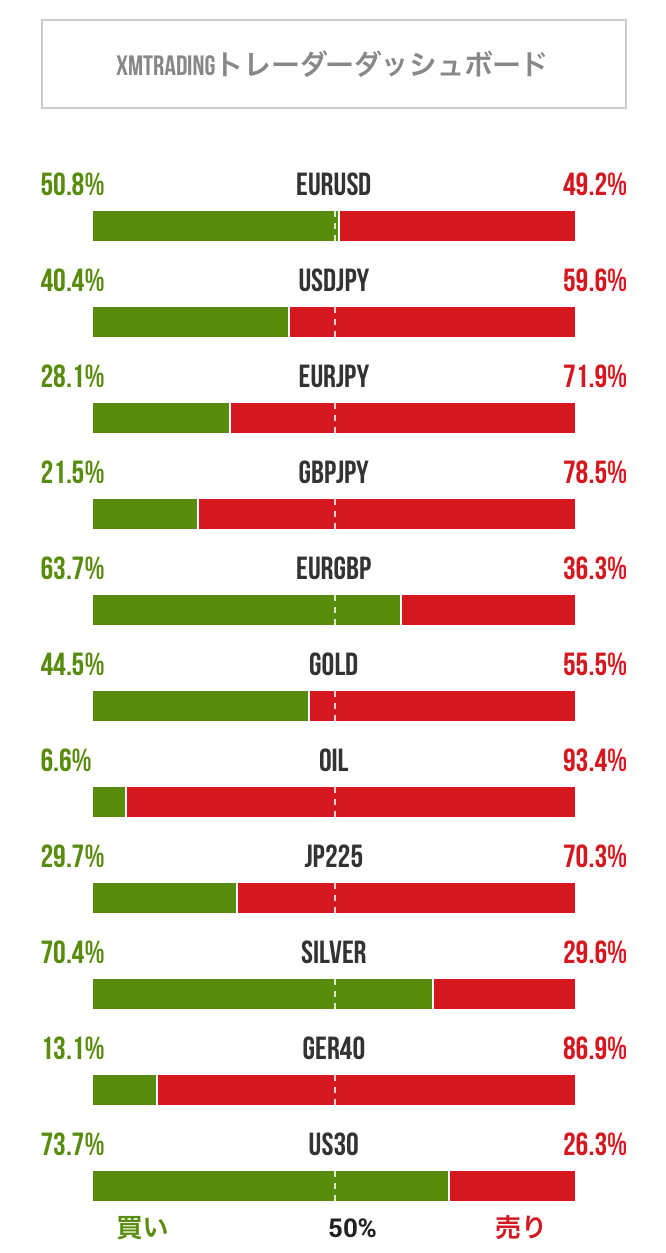 FX (Forex) トレーダーのポジション比率/ときたま更新 2026-01-14 FX、ゴールド、原油、日経225、シルバーなどについてトレーダーのポジション比率を掲載しています。トレードの参考にご利用ください。 2026年01月14日 20:55 のデータ 引用元:XMTradi...