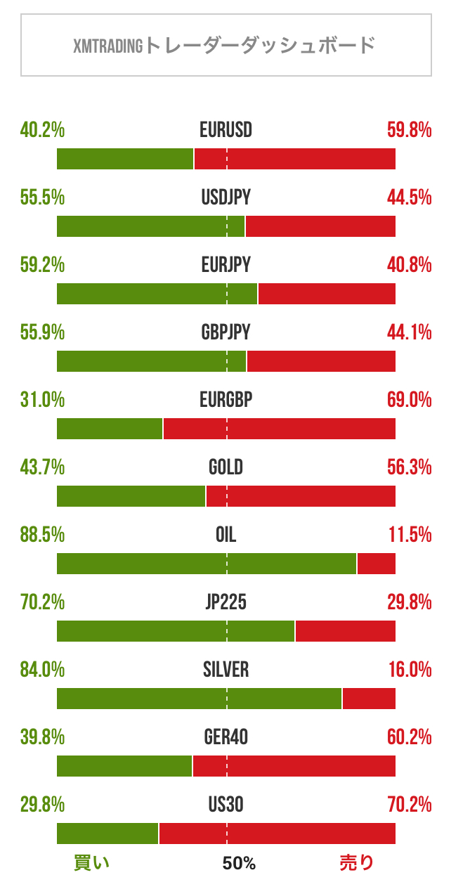 FX (Forex) トレーダーのポジション比率/ときたま更新 2026-02-11 FX、ゴールド、原油、日経225、シルバーなどについてトレーダーのポジション比率を掲載しています。トレードの参考にご利用ください。 2026年02月11日 20:07 のデータ 引用元:XMTradi...
