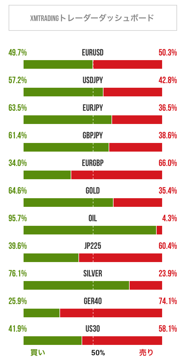 FX (Forex) トレーダーのポジション比率/ときたま更新 2026-02-17 FX、ゴールド、原油、日経225、シルバーなどについてトレーダーのポジション比率を掲載しています。トレードの参考にご利用ください。 2026年02月17日 20:12 のデータ 引用元:XMTradi...