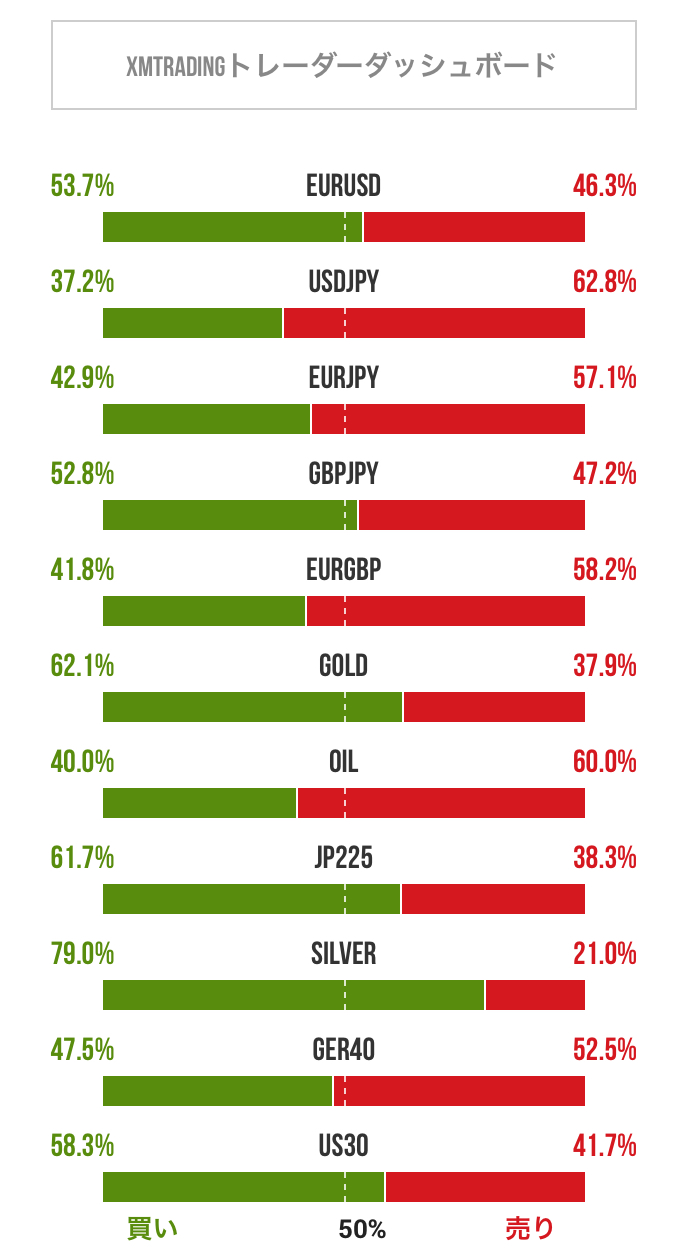 FX (Forex) トレーダーのポジション比率/ときたま更新 2026-02-23 FX、ゴールド、原油、日経225、シルバーなどについてトレーダーのポジション比率を掲載しています。トレードの参考にご利用ください。 2026年02月23日 20:05 のデータ 引用元:XMTradi...