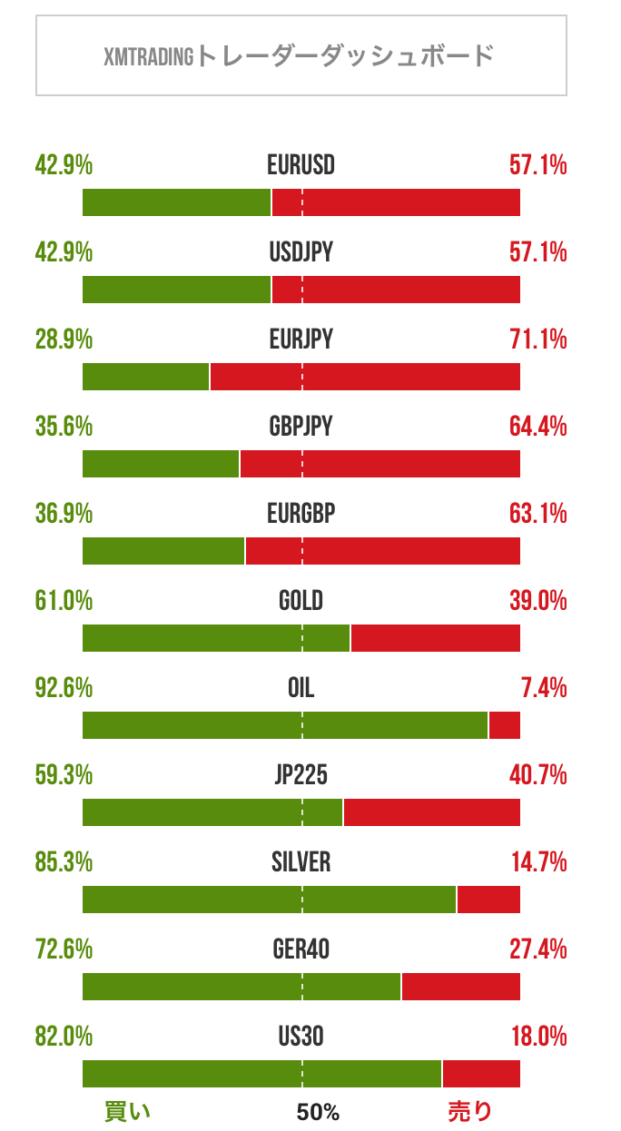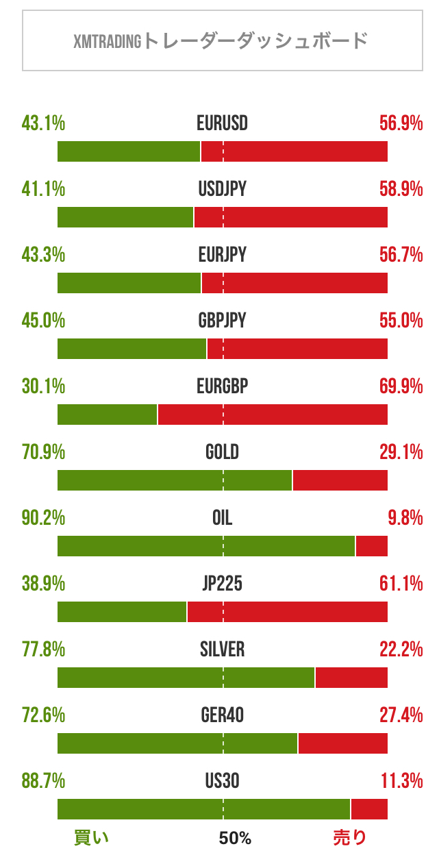 FX (Forex) トレーダーのポジション比率/ときたま更新 2026-02-25 FX、ゴールド、原油、日経225、シルバーなどについてトレーダーのポジション比率を掲載しています。トレードの参考にご利用ください。 2026年02月25日 16:36 のデータ 引用元:XMTradi...
