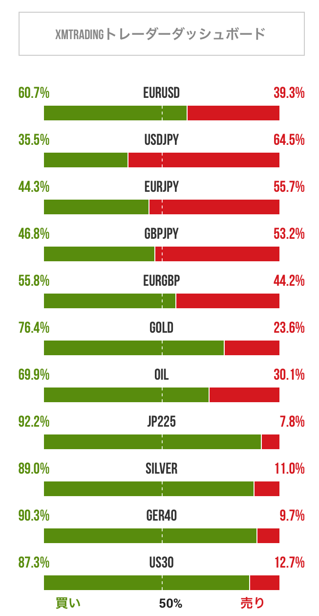FX (Forex) トレーダーのポジション比率/ときたま更新 2026-03-04 FX、ゴールド、原油、日経225、シルバーなどについてトレーダーのポジション比率を掲載しています。トレードの参考にご利用ください。 2026年03月04日 12:33 のデータ 引用元:XMTradi...