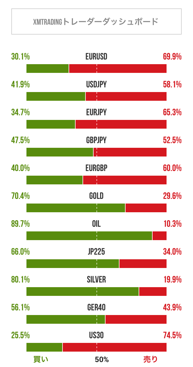 FX (Forex) トレーダーのポジション比率/ときたま更新 2026-02-09 FX、ゴールド、原油、日経225、シルバーなどについてトレーダーのポジション比率を掲載しています。トレードの参考にご利用ください。 2026年02月09日 22:08 のデータ 引用元:XMTradi...